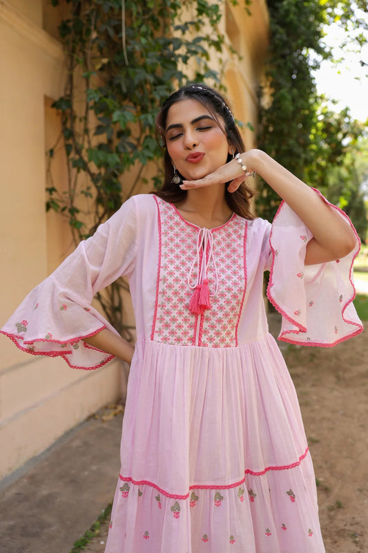 • Pink Floral Cotton Block Printed Midi Tiered Dress