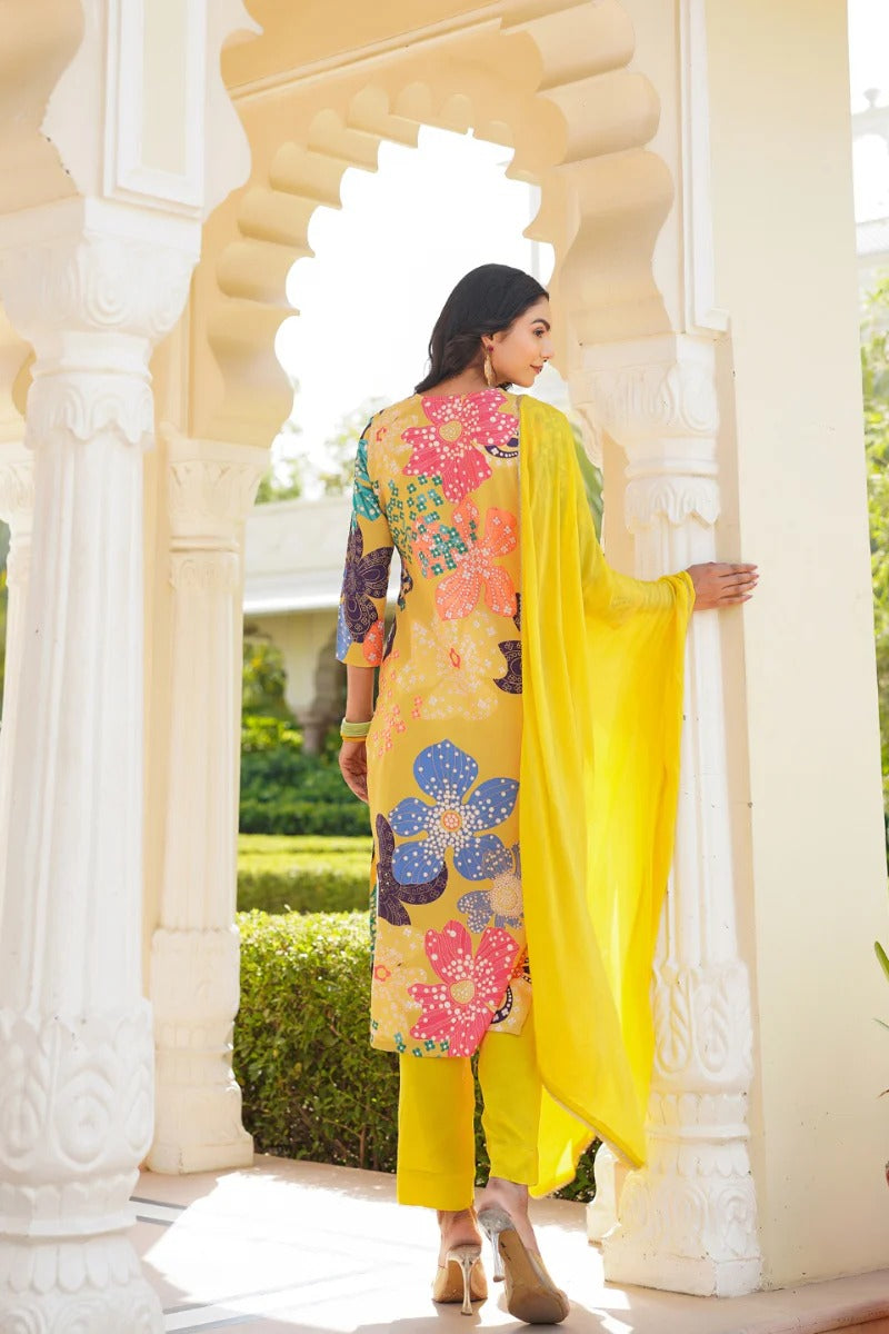 Yellow Floral Printed Cotton Blend Kurta Pant with Dupatta, 3pc set