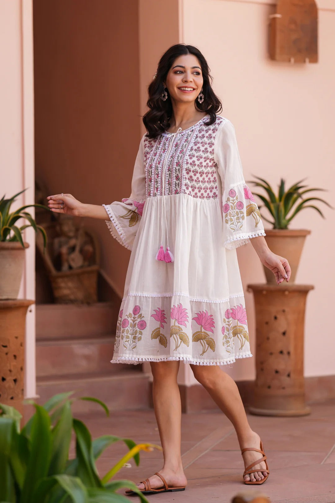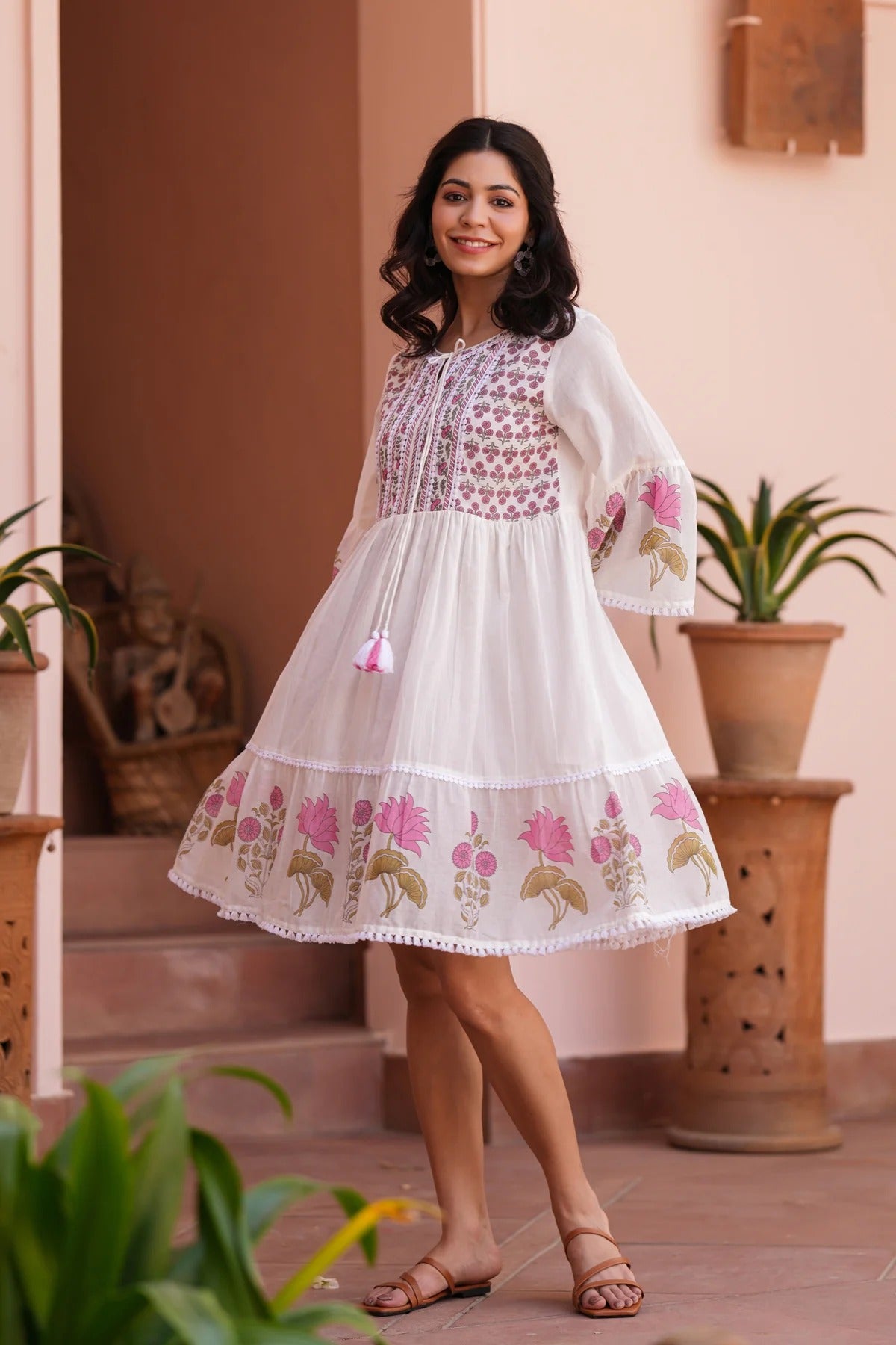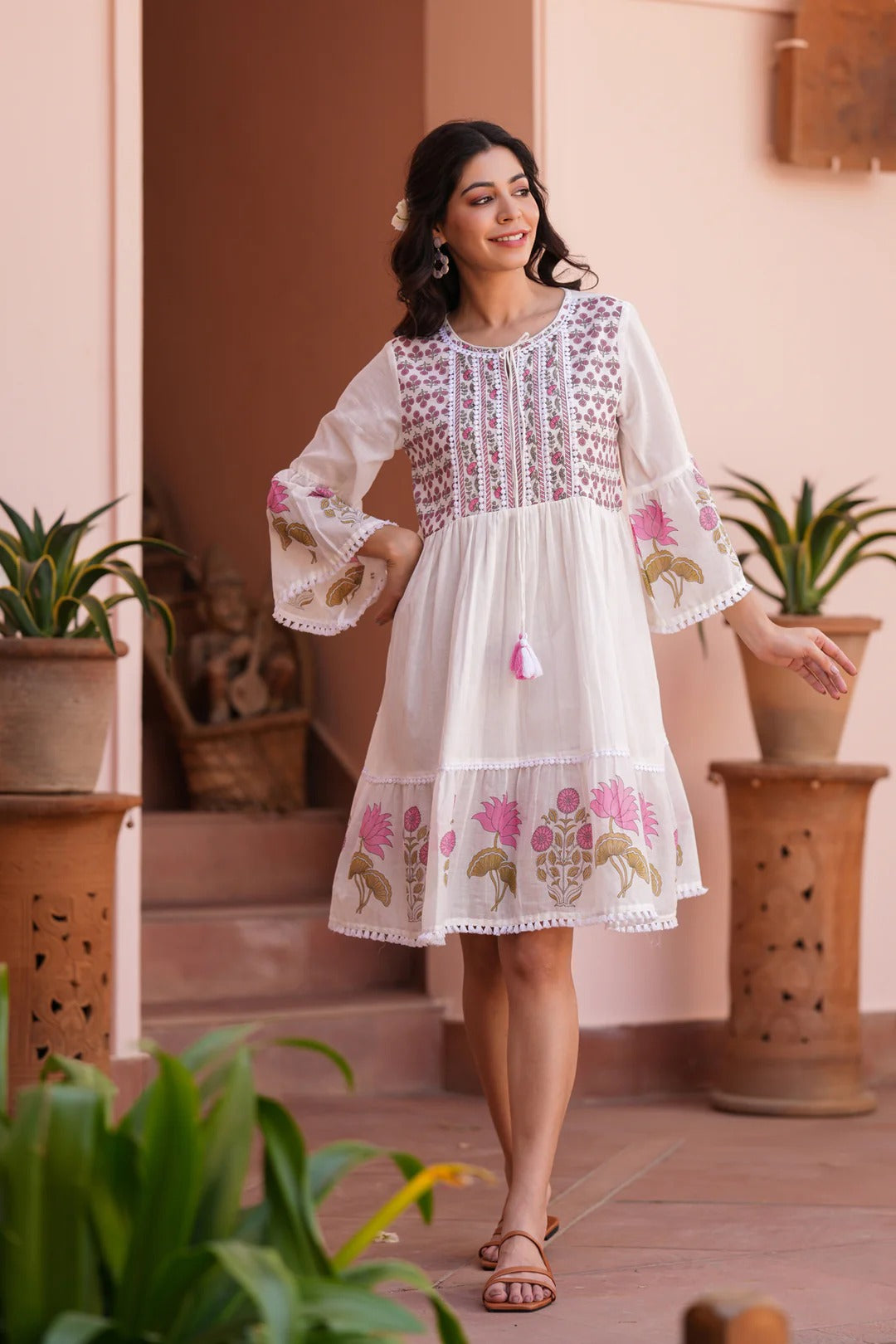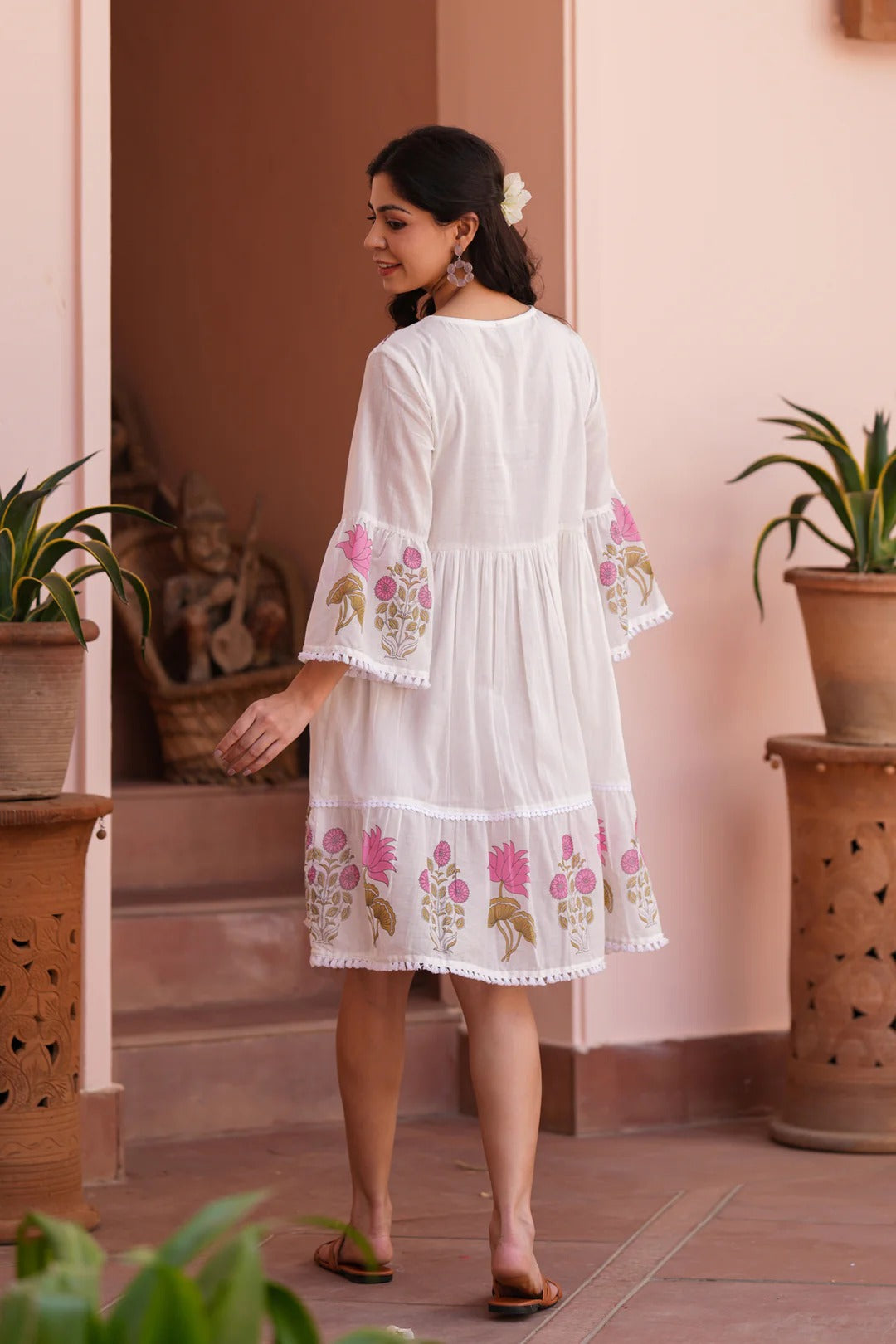 Pink Floral Cotton Block Printed Midi Tiered Dress