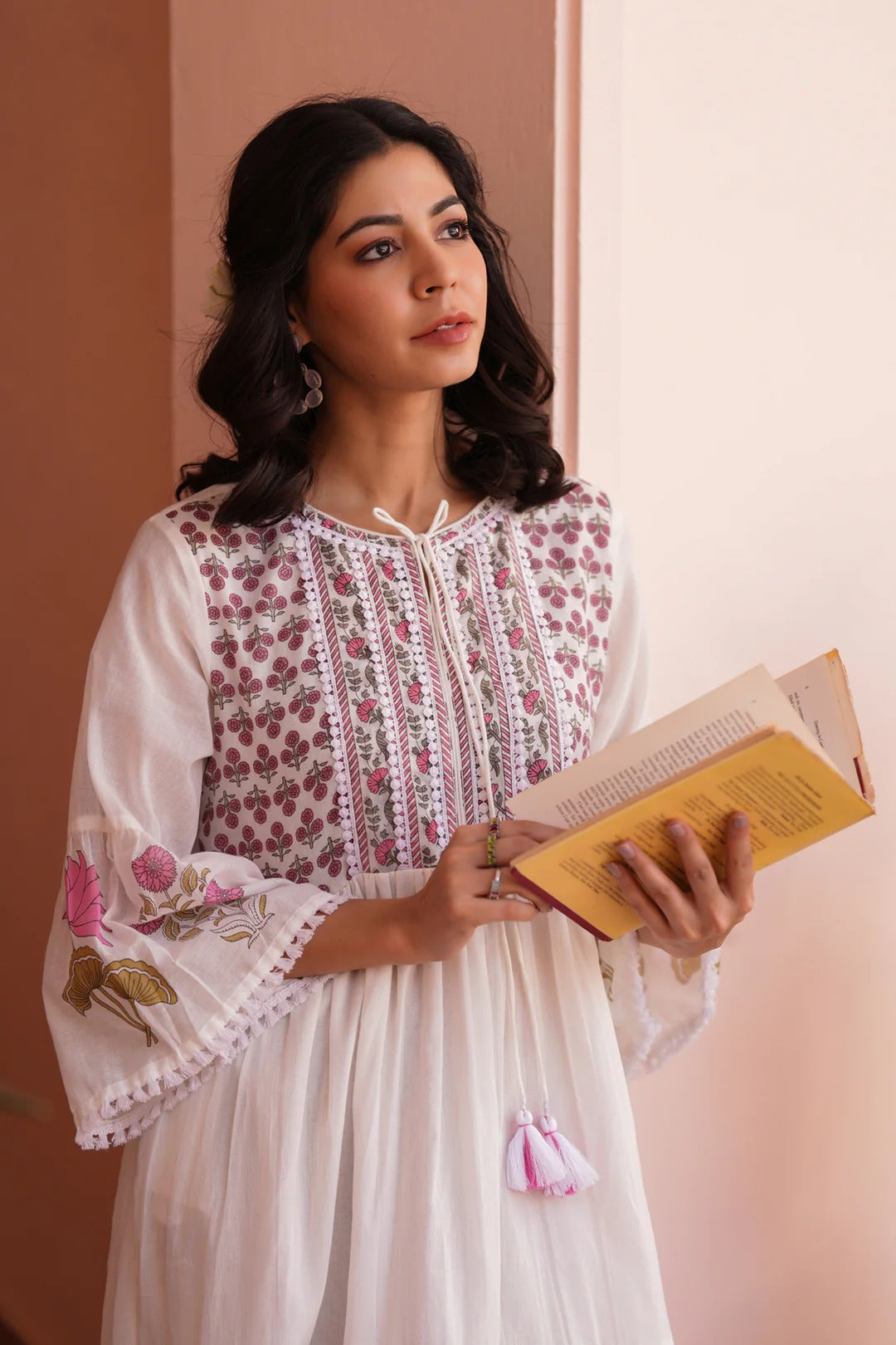 Add a playful touch to your summer wardrobe with this beautifully crafted floral-solid midi dress. Made from soft, breathable cotton, the dress features a round neckline with tasseled tie strings, 3/4th bell sleeves adorned with dainty tassel lace, and a two-tiered silhouette that’s as flattering as it is fun. Thoughtfully designed, the first tier is kept solid to balance the printed bodice and hem tier, while delicate cotton lace adds charm and texture. Fully lined with soft voile for comfort, this dress is perfect for breezy brunches, casual outings, or festive daytime celebrations.