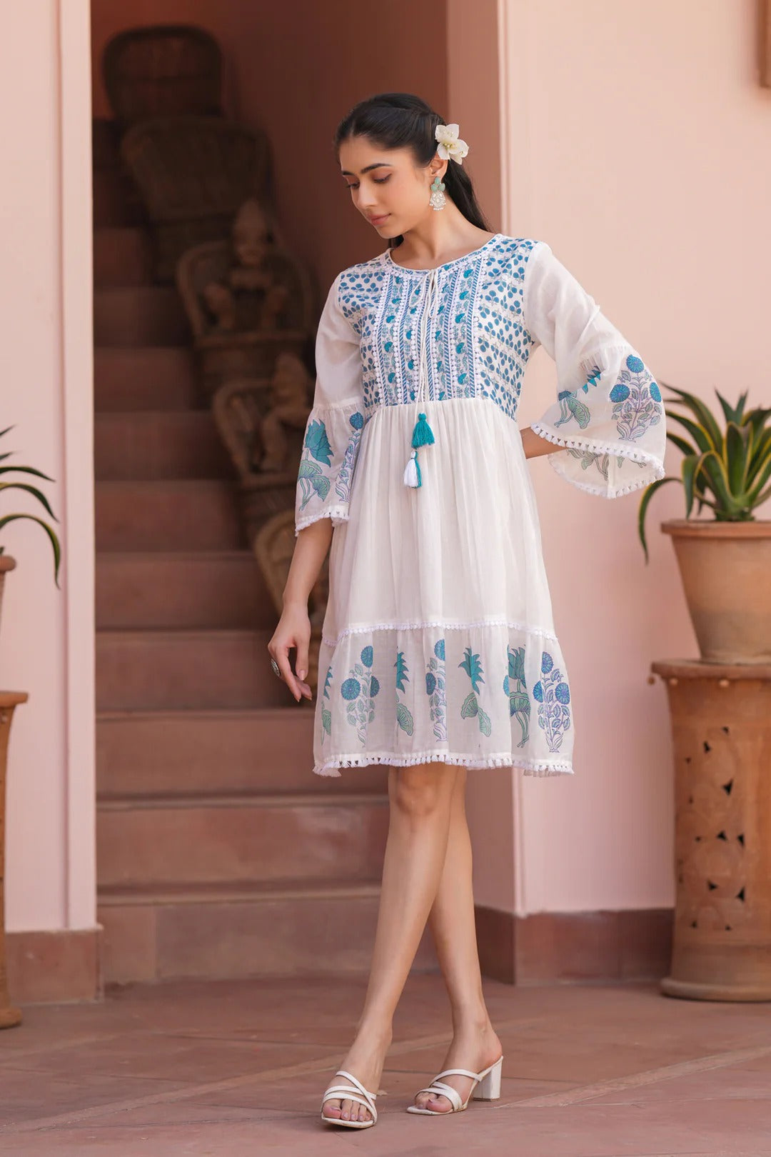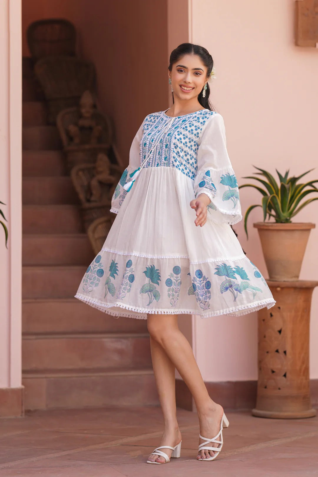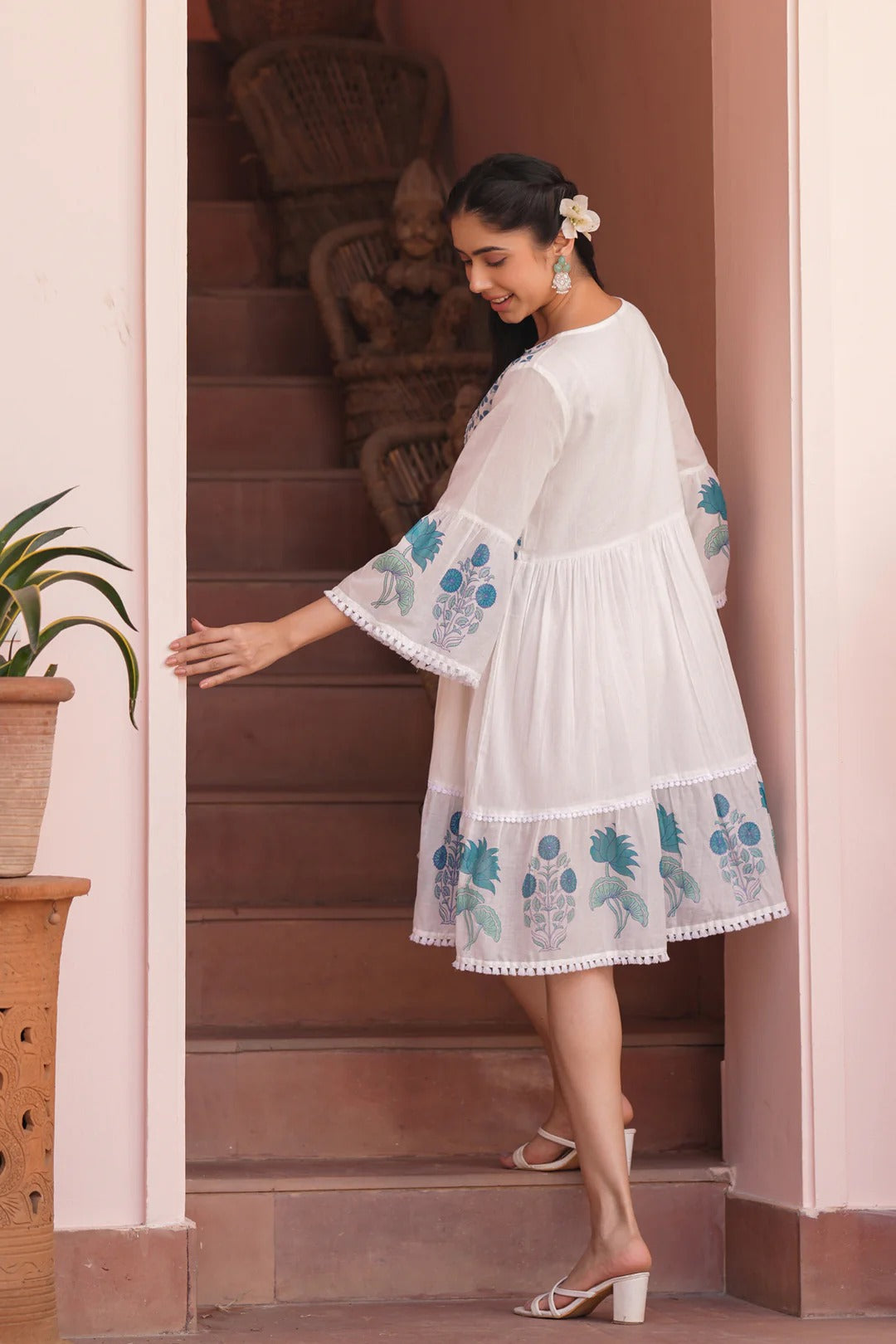 Teal Floral Cotton Block Printed Midi Tiered Dress