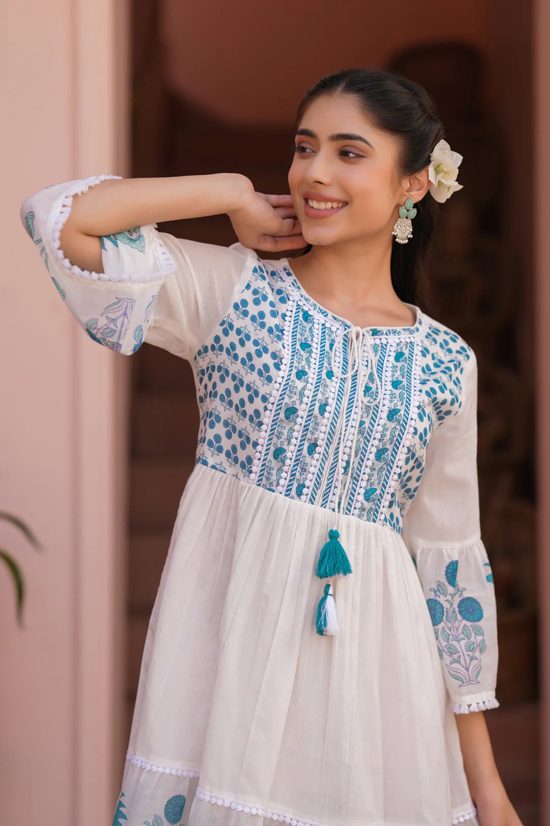 Add a playful touch to your summer wardrobe with this beautifully crafted teal floral-solid midi dress. Made from soft, breathable cotton, the dress features a round neckline with tasseled tie strings, 3/4th bell sleeves adorned with dainty tassel lace, and a two-tiered silhouette that’s as flattering as it is fun. Thoughtfully designed, the first tier is kept solid to balance the printed bodice and hem tier, while delicate cotton lace adds charm and texture. Fully lined with soft voile for comfort, this dress is perfect for breezy brunches, casual outings, or festive daytime celebrations.
