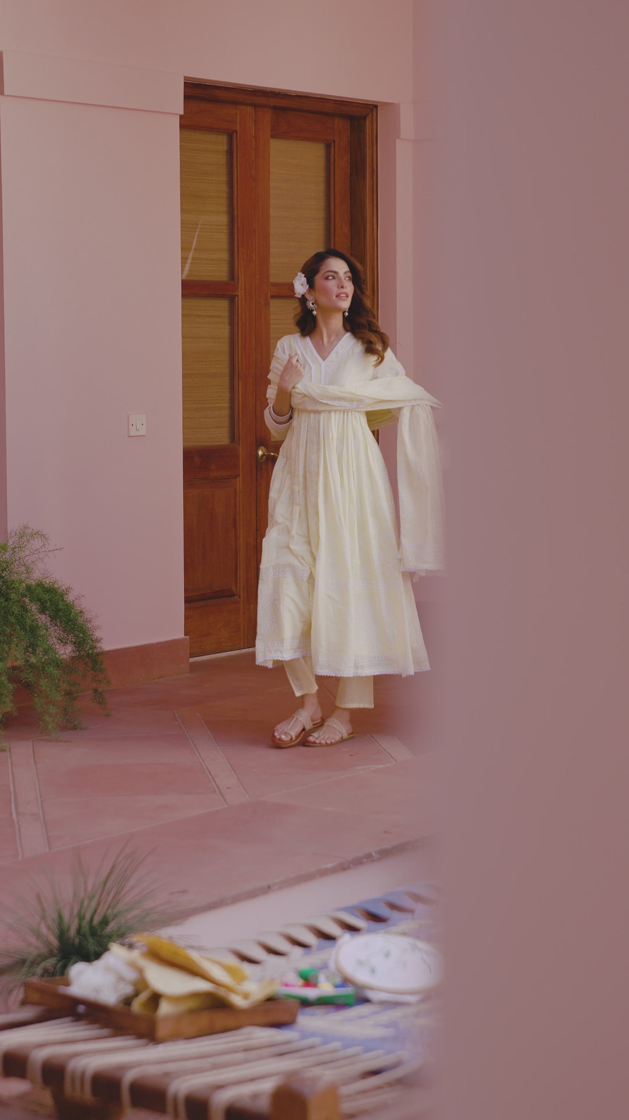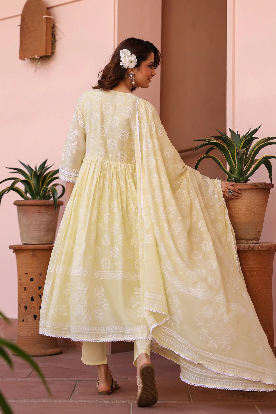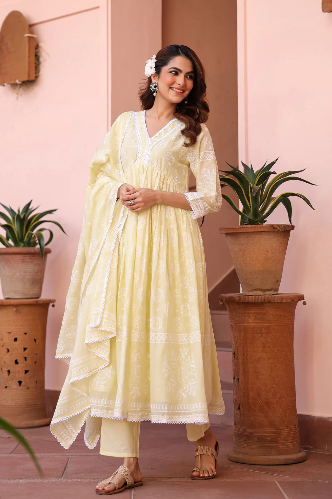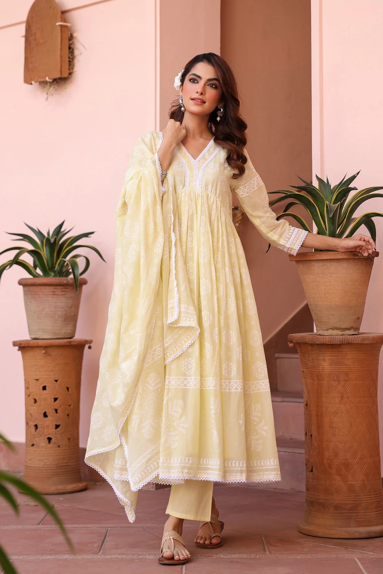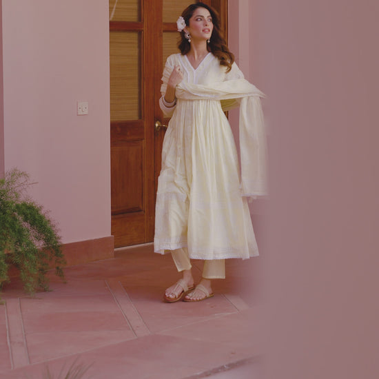 A breezy blend of elegance and ease—this soft cotton mulmul Anarkali set is designed for effortless festive charm. The kurta features a flattering V neckline, 3/4th sleeves, and an empire-gathered flared silhouette, beautifully adorned with delicate lace detailing. Lined with soft cotton voile, it promises all-day comfort. Paired with solid cambric pants and a matching Khari-printed mulmul dupatta finished with lace-edged borders, this ensemble is a perfect choice for summer festivities, intimate celebrations, and special occasions.