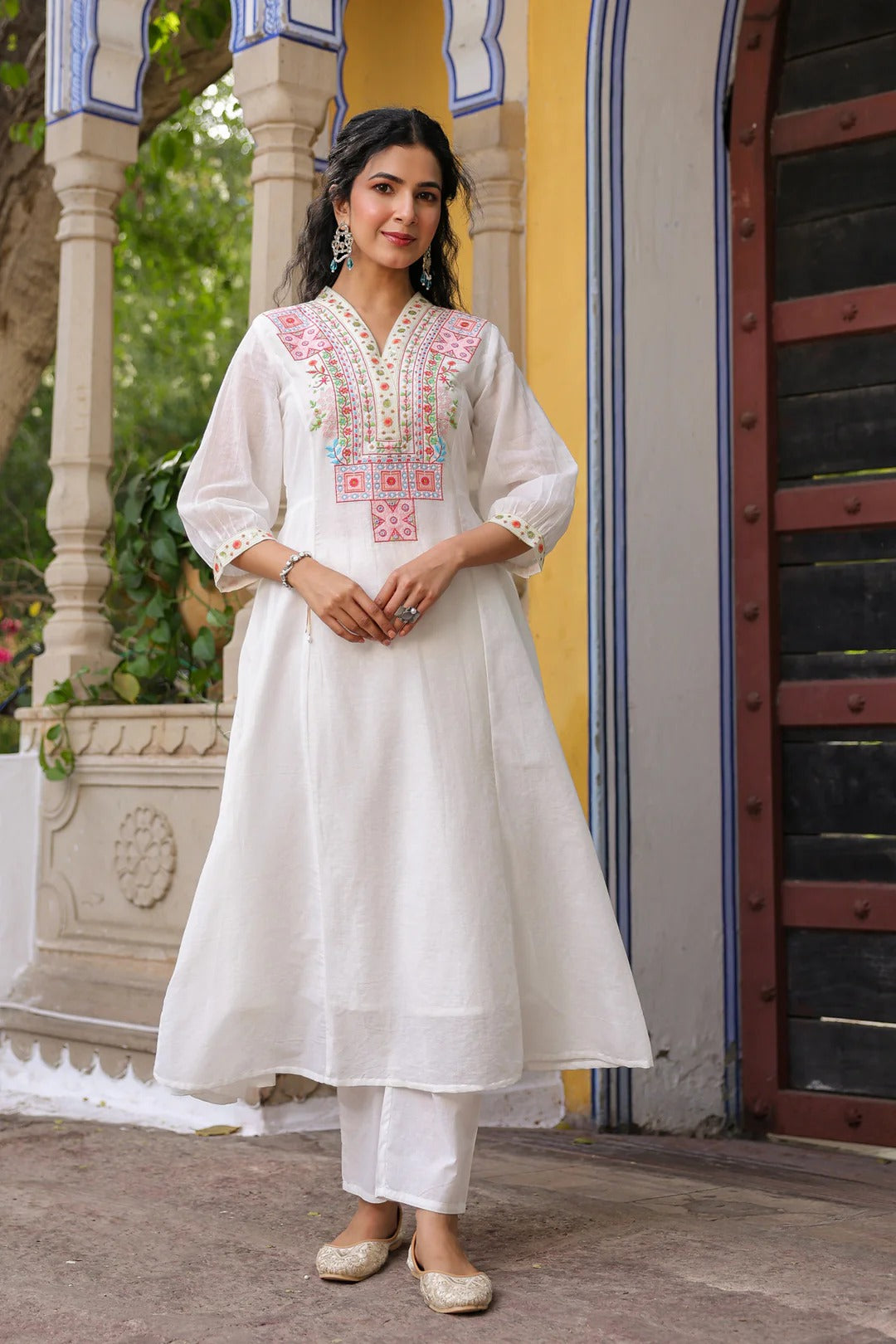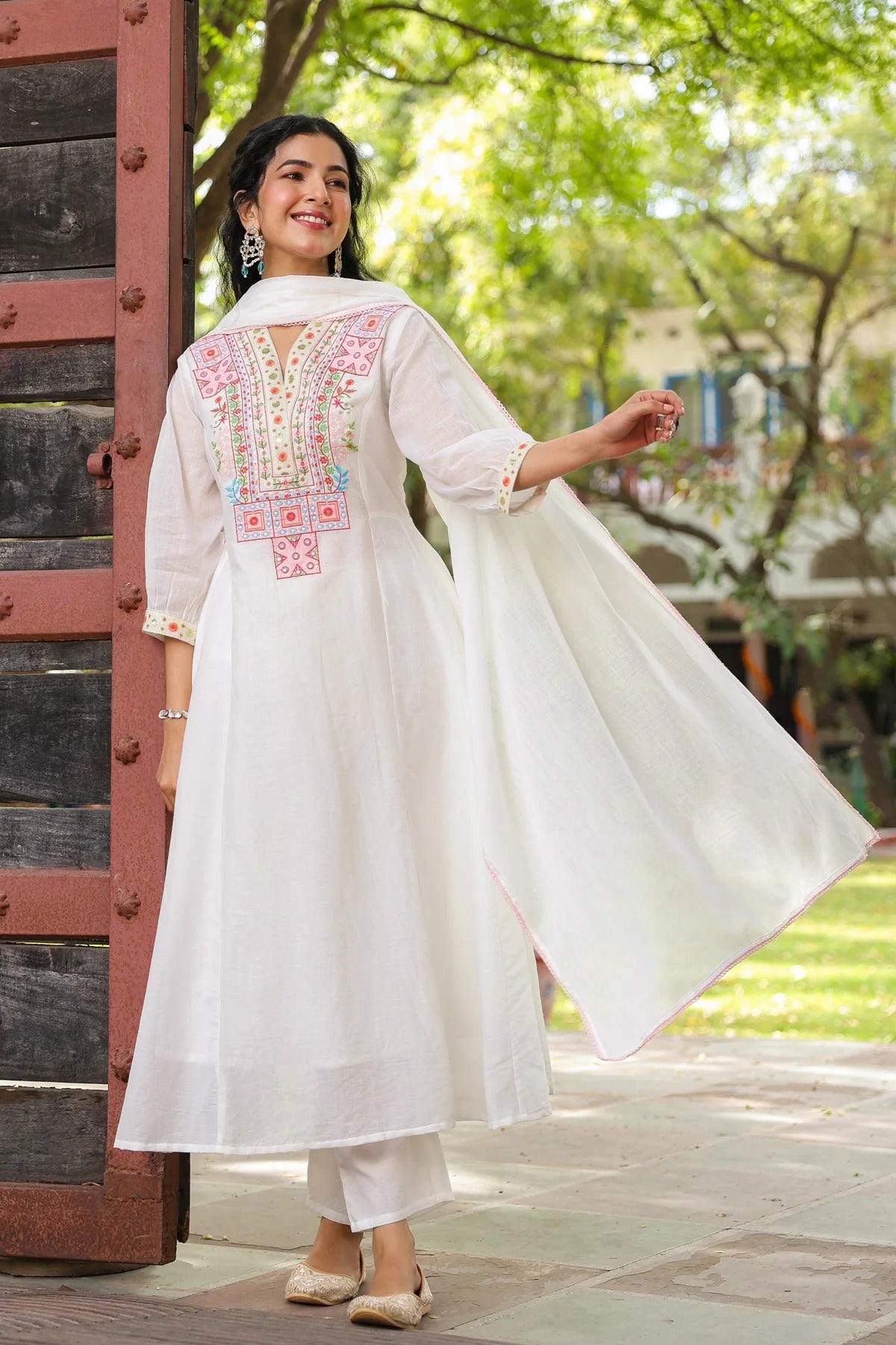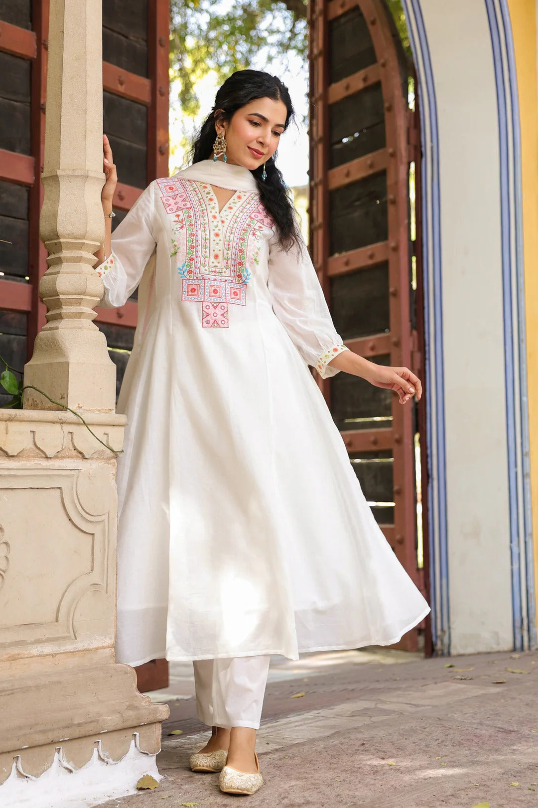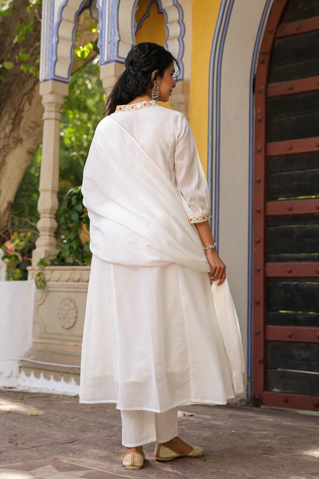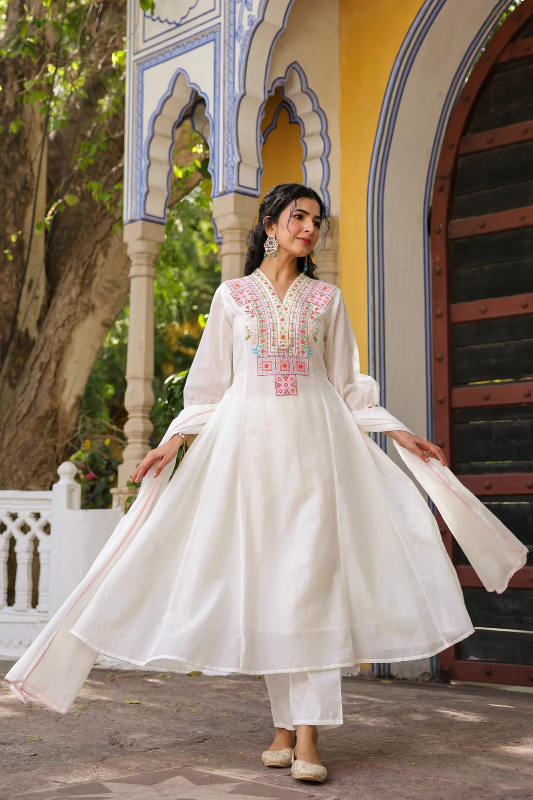 White Cotton Mulmul Yoke Embroidered Anarkali Suit Set